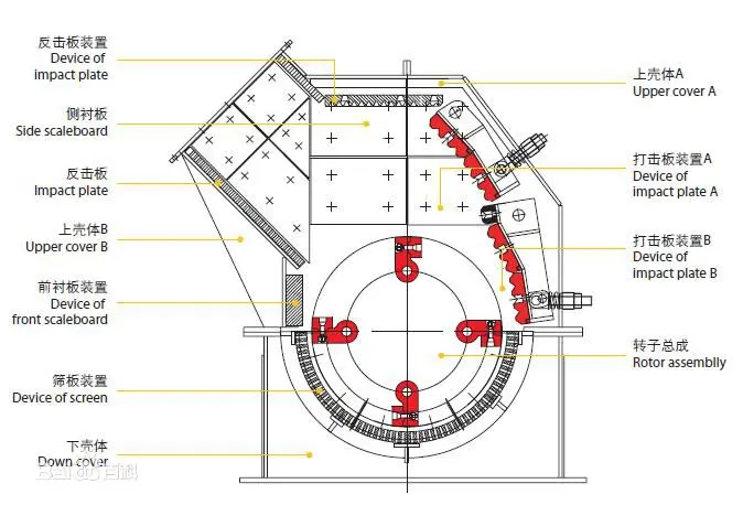 Rakenne on yksinkertainen ja koostuu kotelosta, roottorista ja iskulevystä. Impact-murskaimen pääasiallinen osa on nopea pyörivä roottori levyvasaralla. Edellyttävän iskuprosessin aikana materiaalilohkot törmäävät myös keskenään. Kun materiaali lyö levyvasaraa, iskulevyn ja toistensa törmäyksen vaikutus, halkeamat ja löysäminen syntyy jatkuvasti sisälle, mikä johtaa lopulta murskaamiseen. Impact -laitetta käytetään kestämään levyvasaran osumaa materiaalia ja palauttaa sen. Pääkomponentti on iskulevy, joka on hitsattu teräslevyillä. Impact-pinnalla on kulutuskesistenttiä vuorauksia ja jotkut käyttävät iskupalkkeja tai ritilälevyjä.